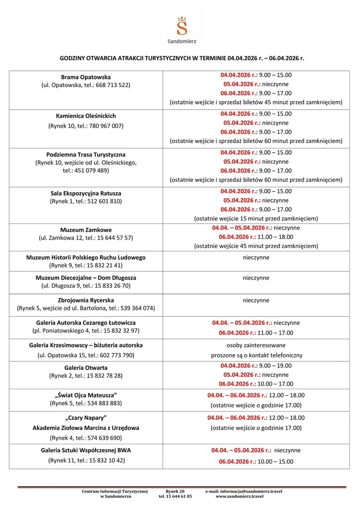 Wielkanocny weekend w Sandomierzu zwykle nie pędzi – raczej zwalnia i zachęca, by zejść z utartych tras. Właśnie wtedy przydaje się wiedza, kiedy otwarte są najważniejsze miejskie atrakcje, bo spacer po starówce, zejście do Podziemnej Trasy Turystycznej czy wejście na Bramę Opatowską wymagają trochę lepszego planu niż zwykły wypad w ciągu tygodnia. Pracownicy Centrum Informacji Turystycznej przygotowali zestawienie godzin otwarcia na okres świąt wielkanocnych, obejmujące dni od 4 do 6 kwietnia 2026 roku.